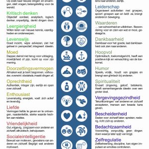 Ieder mens heeft de 24 sterke kanten, maar er zijn er een aantal die kenmerkend voor jou zijn. Deze signature strengths, kenmerkende sterke kanten geven je energie, kosten je weinig moeite en je bent er goed in. Mensen hebben zo’n 5 tot 7 kenmerkende sterke kanten. Misschien ben je ook goed in andere sterke kanten, maar dan kosten ze je waarschijnlijk meer moeite. Zo kunnen veel mensen doorzetten of moedig zijn als het nodig is, maar past het niet bij iedereen evenveel.